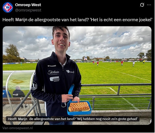 We zijn zelf trouwens ook de jongste niet meer. Bepaalde teamgenoten hebben nu zelfs een kinderslot in de auto, zodat de stiefzoon niet ontsnapt. Diezelfde auto had zijn dag niet helemaal, want die werd die ochtend vakkundig achteruit in het aanhangwagentje van de buurman gemanoeuvreerd. De eigenaar was zodanig van slag dat hij vergat dat hij TeamFruit was en moest zodoende op een bruine fruitschaal trakteren. Bij de spelers die onlangs zijn gaan samenwonen met hun vriendin wordt er ook goed gegeten. Zo had Sylvano nog niet ontbeten, maar bij de koffie al wel een appelflap en roombroodje gegeten. Daarna stuurde hij per telefoon zijn vriendin om drie kilo kip voor het avondeten. In huize Riemens wordt trouwens al jaren goed gegeten. Marijn was er vandaag niet, maar deze totaal ongerelateerde, oude foto van Riemens met een gigantische stoeptegel van een Mexicanobroodje willen we u toch niet onthouden.
